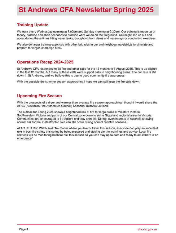 The St Andrews CFA is always looking for new volunteers—and we’d love you to be part of our team! We especially welcome more women and anyone who is home during the day to consider joining, as daytime availability is vital for keeping our community safe. Volunteering isn’t just about firefighting—there are many ways to contribute. Our wonderful non-operational members play a crucial role by helping with administration, fundraising, community outreach, and property advice visits. Whatever your skills or interests, there’s a place for you in the brigade. Stay tuned—this page will be updated soon with more details on how you can get involved.